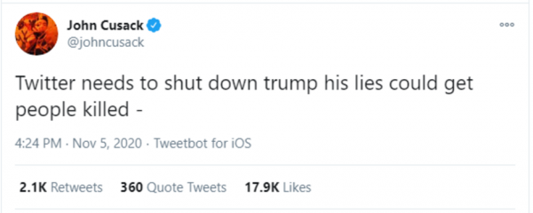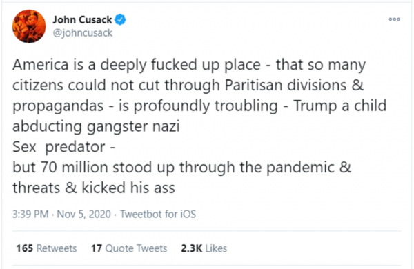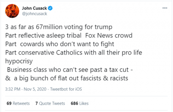 “70 million stood up through the pandemic & threats & kicked his ass?” One has to ask, who’s threatening Biden voters? Biden voters aren’t the victims here. It’s Trump voters who get all the heat for their political views. They get them from the Democrat-loving news outlets, and from unhinged leftist celebrities like John Cusack, as this tweet from November 5 shows: “3 as far as 67million voting for trump Part reflective asleep tribal Fox News crowd Part cowards who don’t want to fight Part conservative Catholics with all their pro life hypocrisy Business class who can’t see past a tax cut – & a big bunch of flat out fascists & racists”