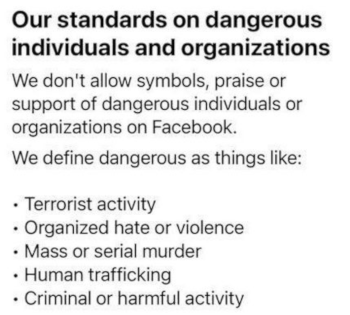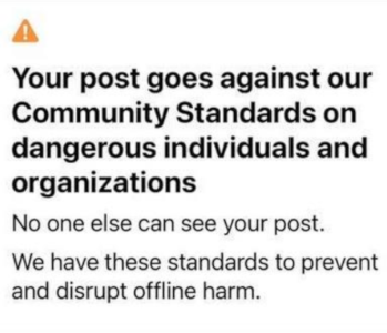 So, according to Facebook and the Atlantic Council, I am now a “dangerous individual,” you know, like a “terrorist,” or a “serial murderer,” or “human trafficker,” or some other kind of “criminal.” Or I’ve been praising “dangerous individuals,” or disseminating their symbols, or otherwise attempting to “sow dissension” and cause “offline harm.”