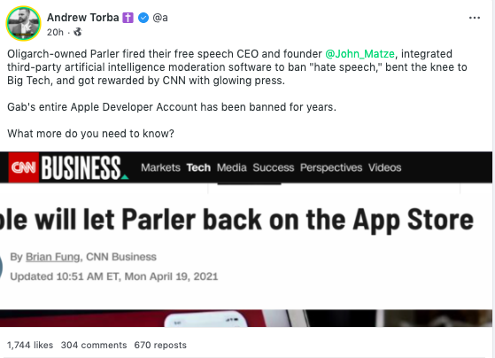 “Conservatives” are celebrating Parler’s capitulation to Apple and transformation into a de facto Big Tech-controlled social network as a “win.” Big Tech’s arbitrary censorship standards are now being applied across Parler by the same artificial intelligence company that Big Tech platforms use, but you won’t find any “conservative” pundits bringing this fact up.